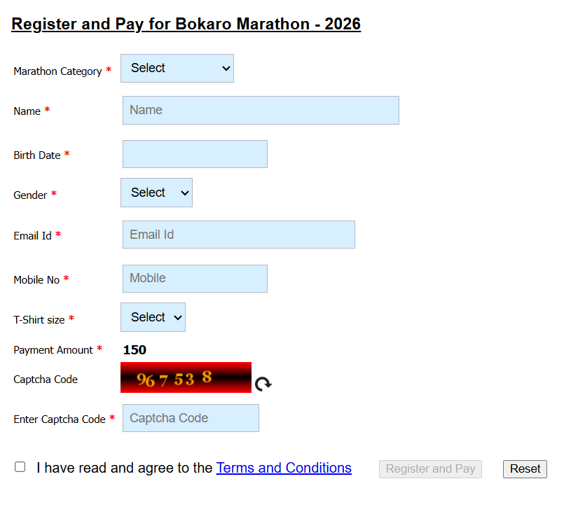 Bokaro marathon 2026 Registration के लिए www.bokaromairathan.com में जाएं। इसमें खुलने के बाद आपको register now का link दिखेगा, जिसको क्लिक करके आप रजिस्ट्रेशन डिटेल भरने के फॉर्म में आ जाएंगे।